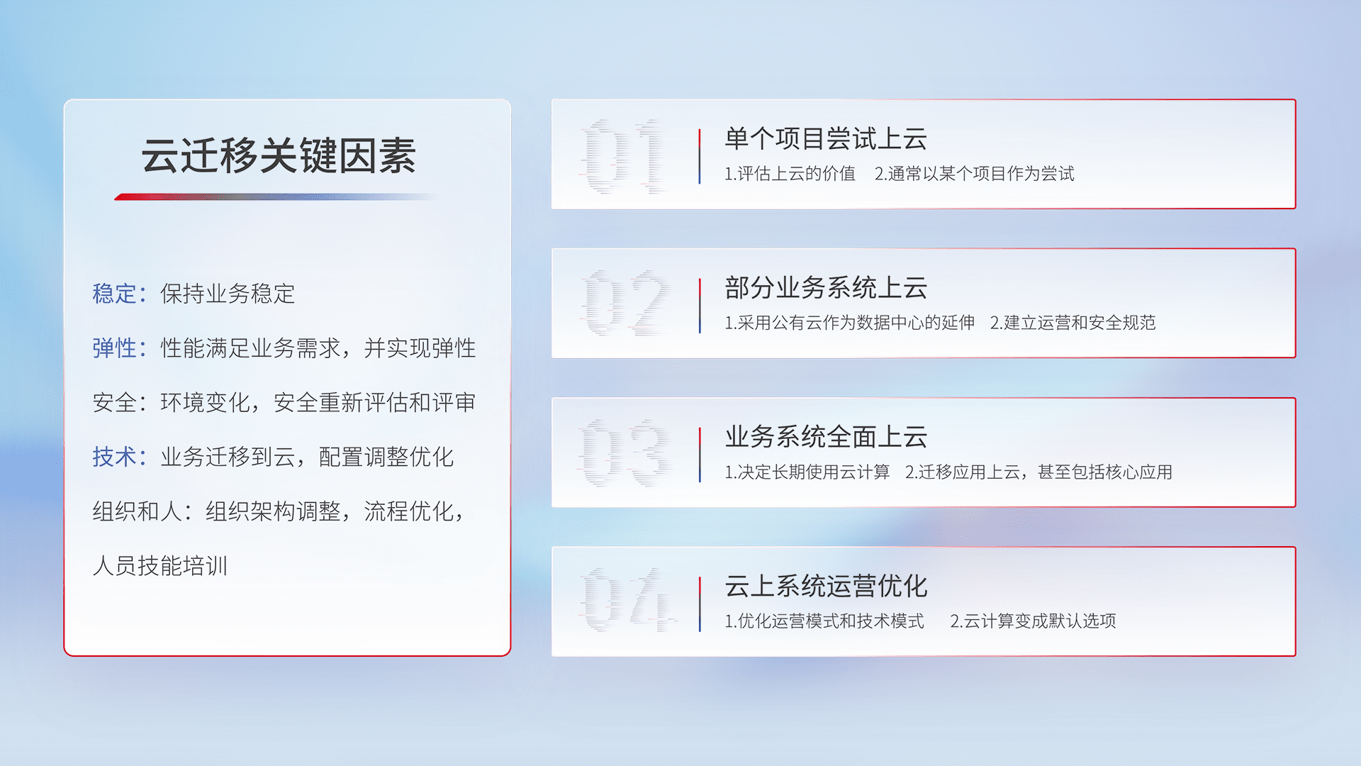 结合实际业务,,,从规划设计、、、、云平台选型、、云原生改造、、、、数据迁移、、、、集成交付,,迁移全过程为客户识别最佳上云路径,,做好风险识别管理,,,,设计网络架构、、、、身份权限、、、安全审计合规、、操作审计、、、日志审计、、、、监控告警策略、、、多站点容灾设计等,,对云上基础设施进行整体规划,,,提升IT治理水平,,,以满足弹性、、、高可用、、、、高性能的需求。。。。