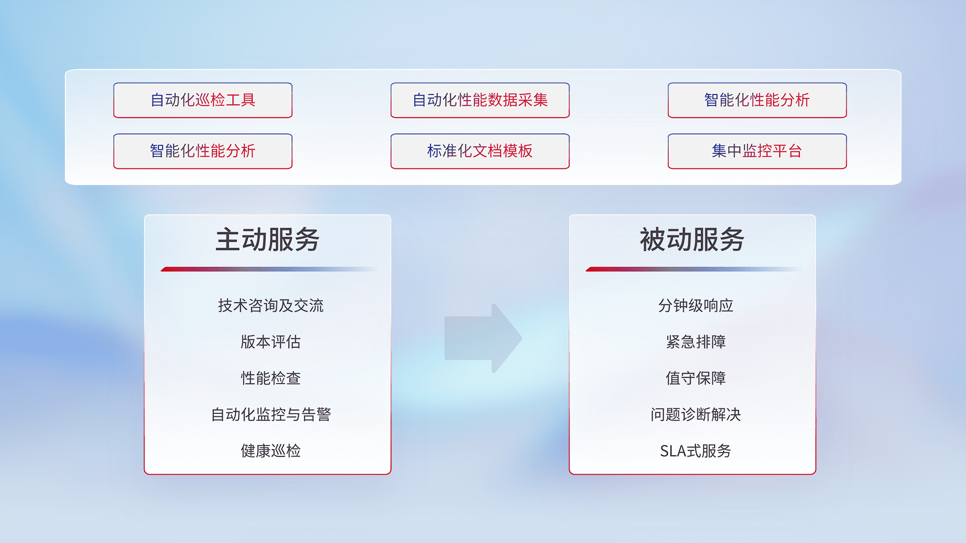 智能化工具和标准化文档,,保障服务质量,,,提供主动服务(包含技术咨询、、版本评估、、、性能检查、、自动化监控与告警、、、健康巡检)和被动服务包含(分钟级响应、、、紧急排障、、值守保障、、问题诊断解决、、、、SLA服务)。。